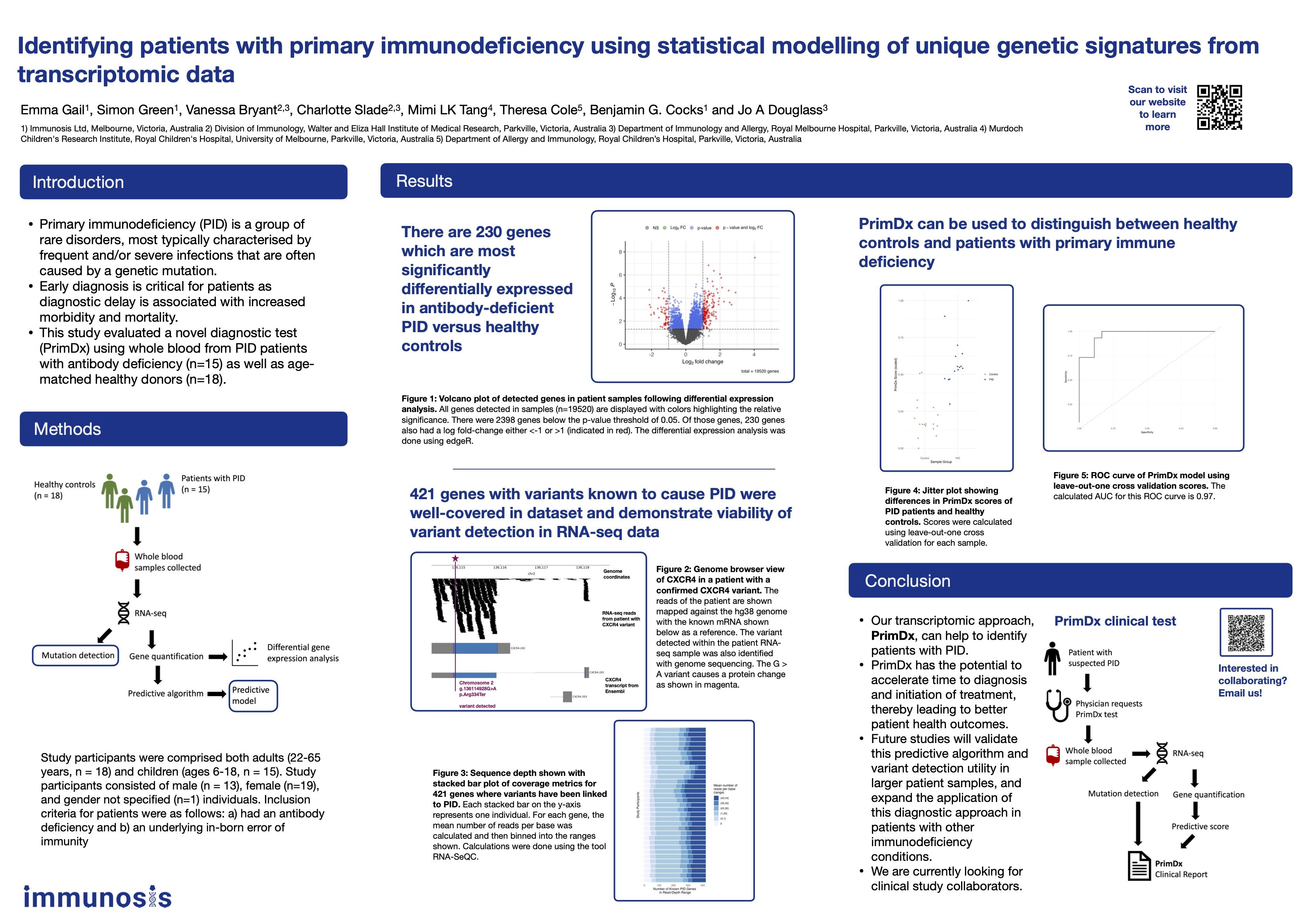 CSO Prof. Ben Cocks and senior scientist Dr Emma Gail attended the Clinical Immunology conference in St. Louis this year, learning about the latest research in the field and meeting with leading clinicians and researchers. Dr Gail presented the work from our first clinical study in the poster titled “Identifying patients with primary immunodeficiency using statistical modelling of unique genetic signatures from transcriptomic data” You can view the full poster here: