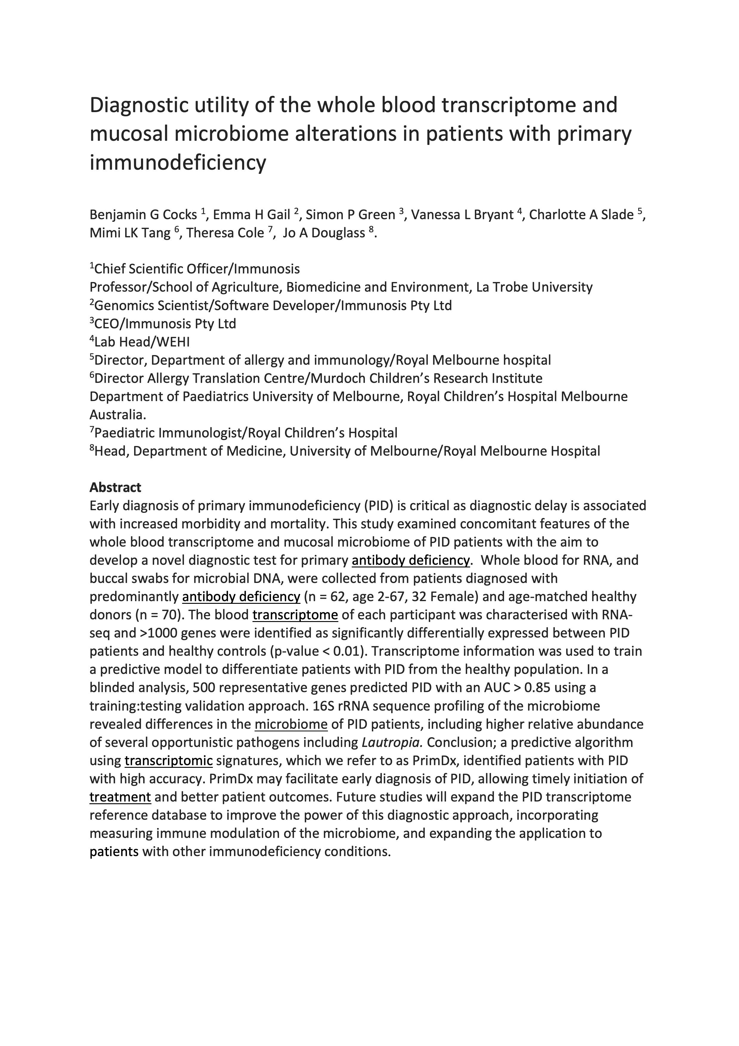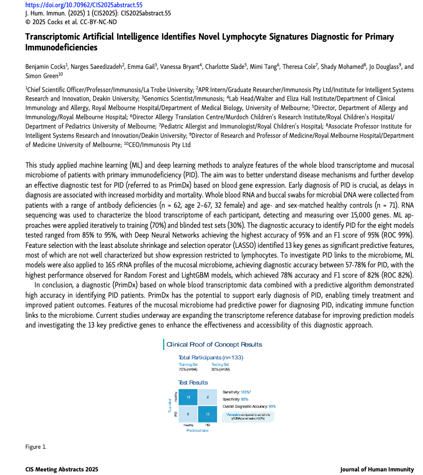 Immunosis CEO Dr Simon Green said “Immunosis are looking forward to welcoming discussion with leading clinicians and investigators on expanding transcriptomic studies for PID complementing other clinical studies".